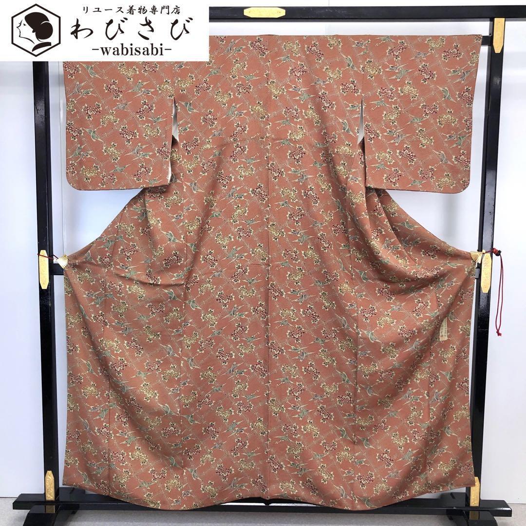 > 小紋 南部幸雄 鳥に花模様 格子柄 弁柄色 縮緬 K-4404 着物 きもの kimono 和服 和装 中古 リサイクル着物 【送料無料】
