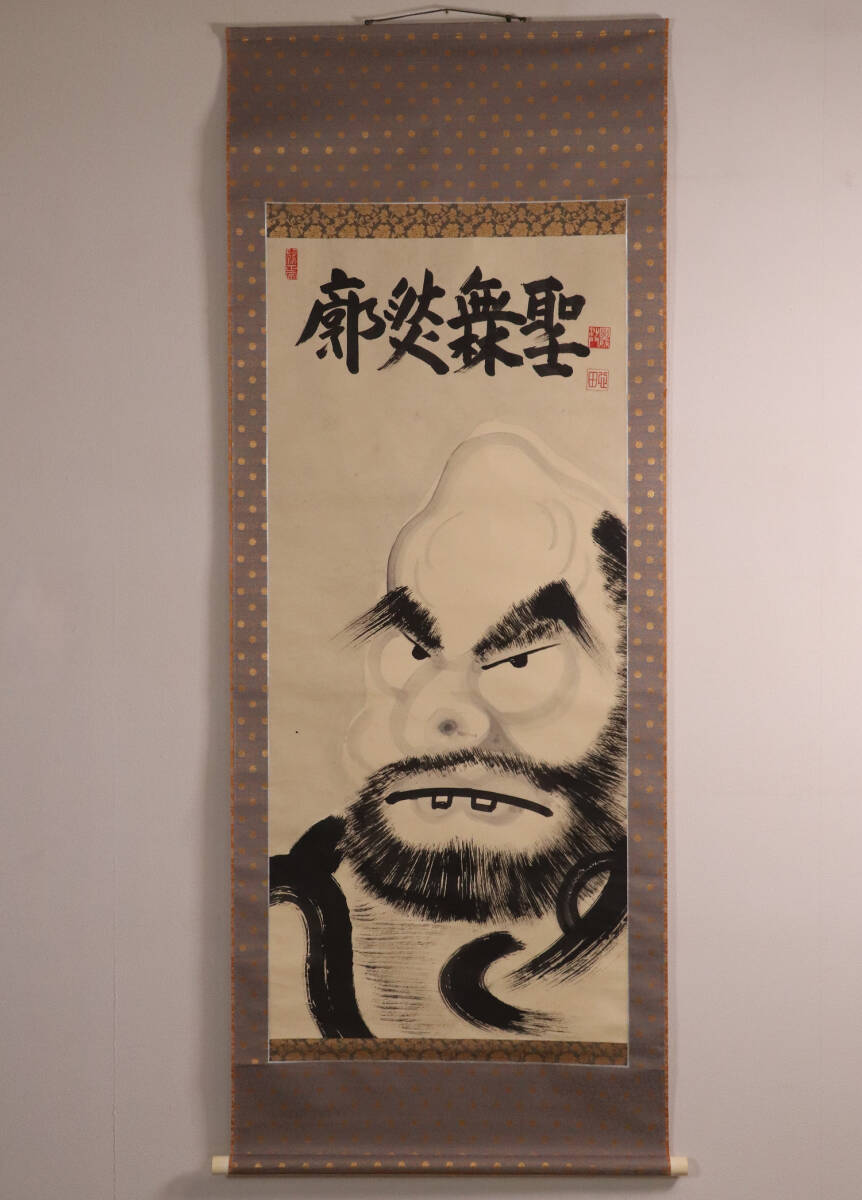 - 【真作】国泰寺派管長 稲葉心田「達磨円覚大師半身像・廓然無聖・画賛」紙本 掛け軸 大幅 木箱 達磨大師 書画 MA442