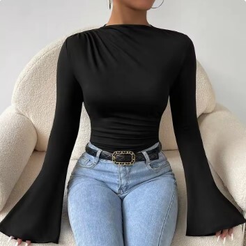 - 女性用長袖ラウンドネックジャンプスーツ,カジュアルジャンプスーツ,単色ボディスーツ,韓国スタイル 色:ブラック サイズ:S