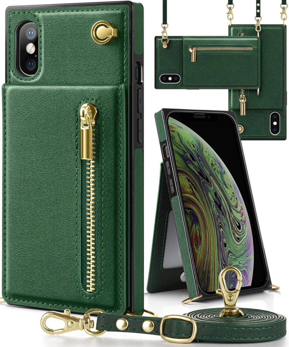 - iphone XS Max ケース手帳型 財布型 携帯ケース 肩掛け 首かけ 斜めがけ ショルダー カード収納 ストラップ付き 長さ調整可能 グリーン