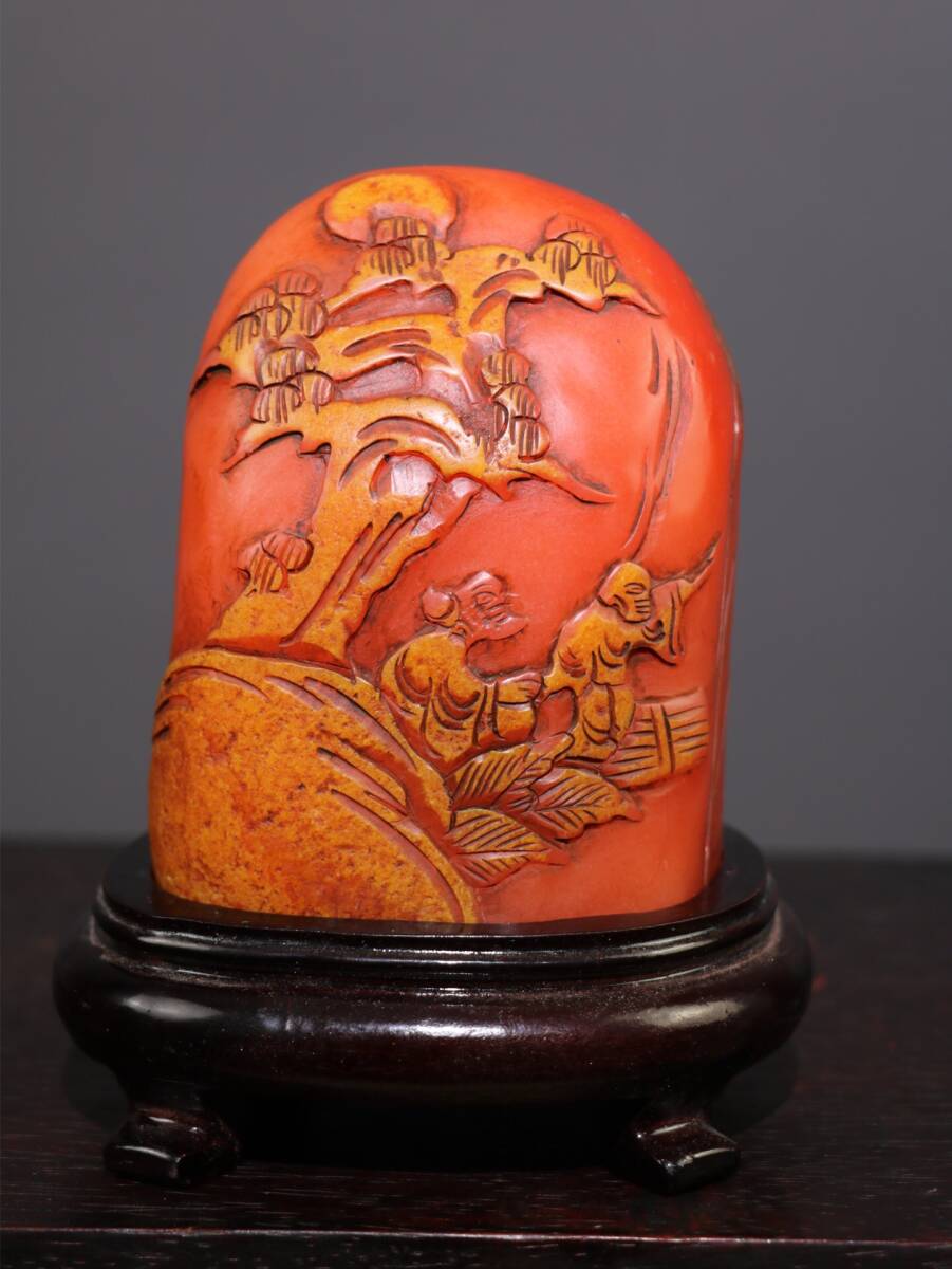 - ▽鴻▽ 寿山石 紅田黄石 細密彫 攜童泛舟訪友紋印章 置物 古賞物 中国古玩 中国古美術