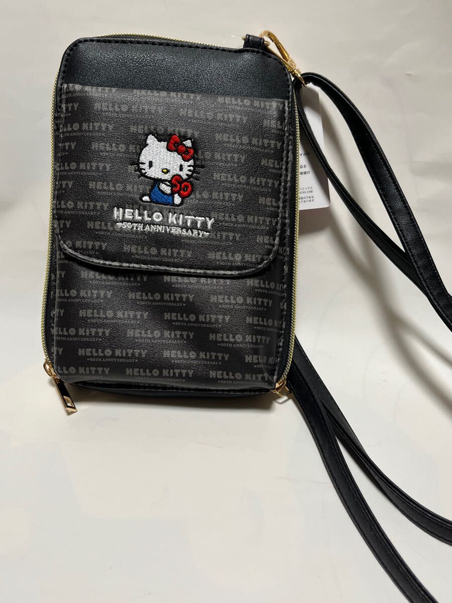- ハローキティ50周年 スマホショルダー マルチポケットショルダーバッグ ポシェット サコッシュ サンリオ HELLO KITTY ブラック ロゴ