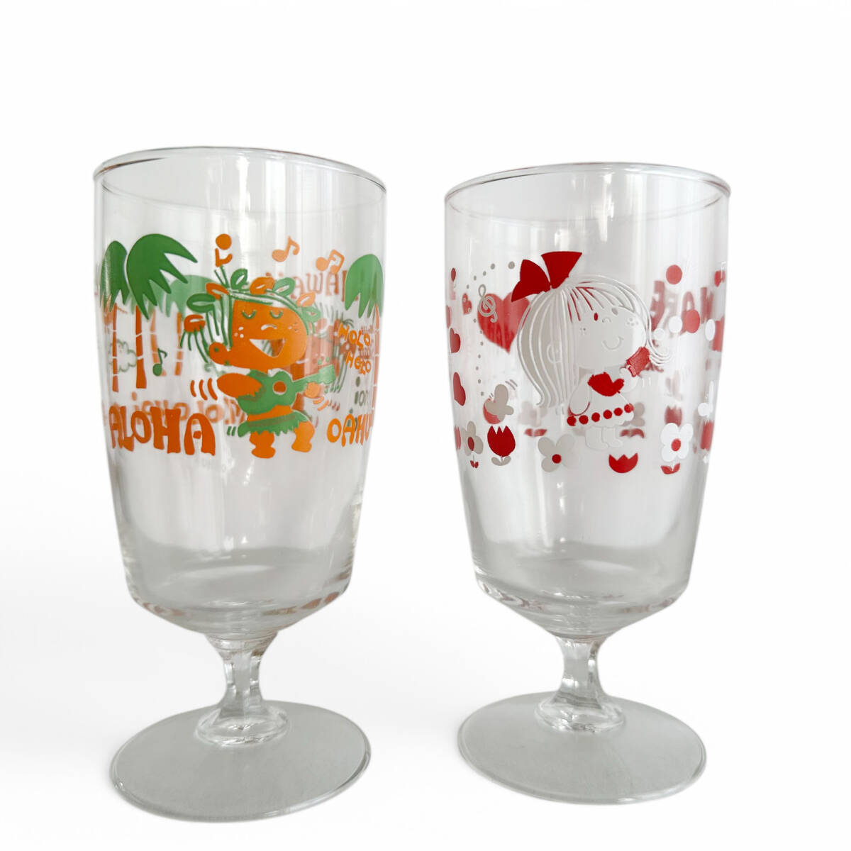 > T7-476 当時物 水森亜土 明治 スカット 足つき グラス 2個セット 販促 非売品 食器 コップ タンブラー 昭和レトロ
