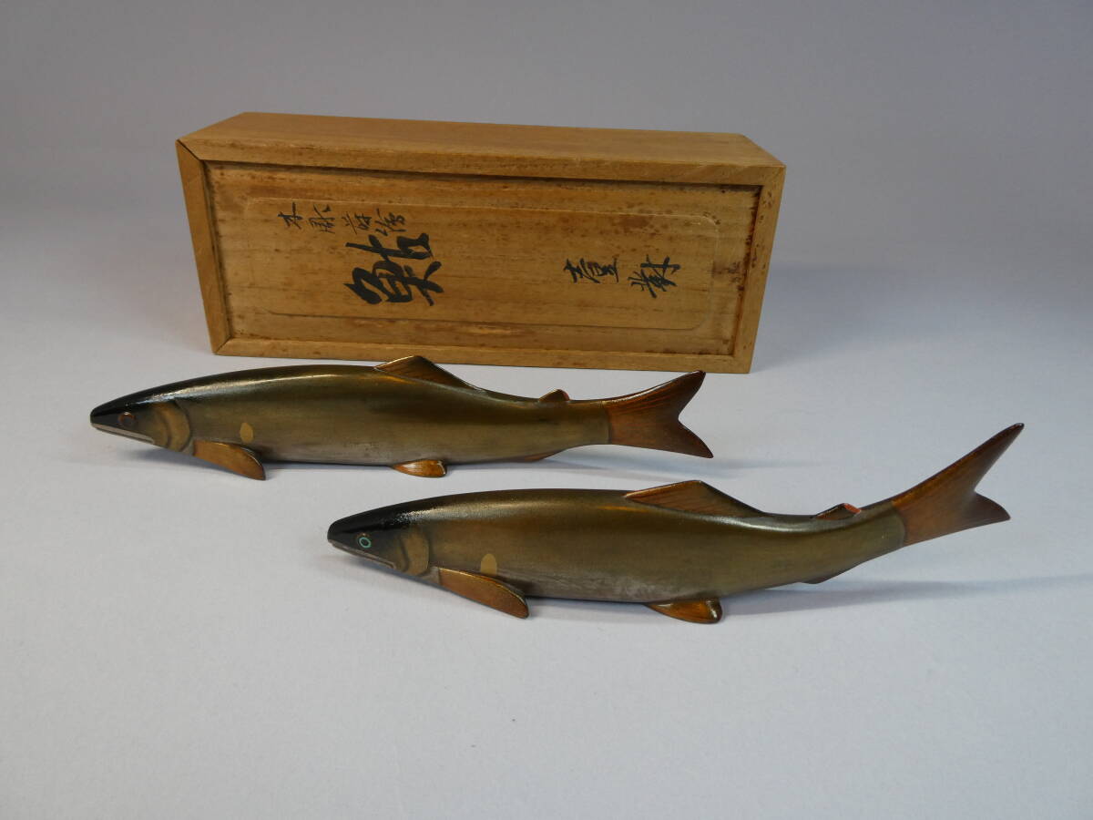 - 目黒清秀作 木彫蒔絵 鮎一対 共箱 漆芸品