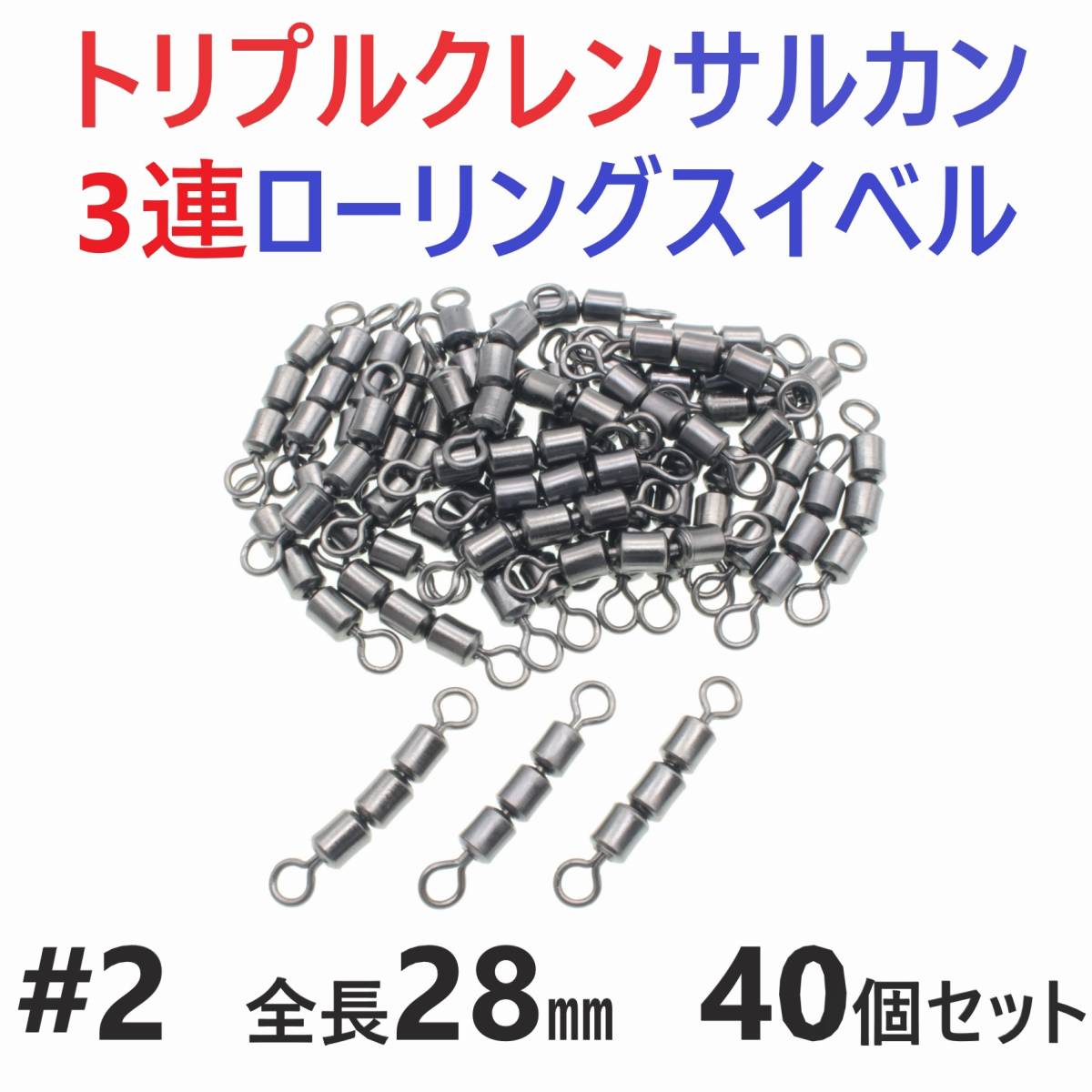 - 【送料180円】トリプルクレン サルカン 3連 ローリングスイベル #2 全長28㎜ 強度43㎏ 40個セット 強力ヨリモドシ 超回転で糸ヨリ解消!
