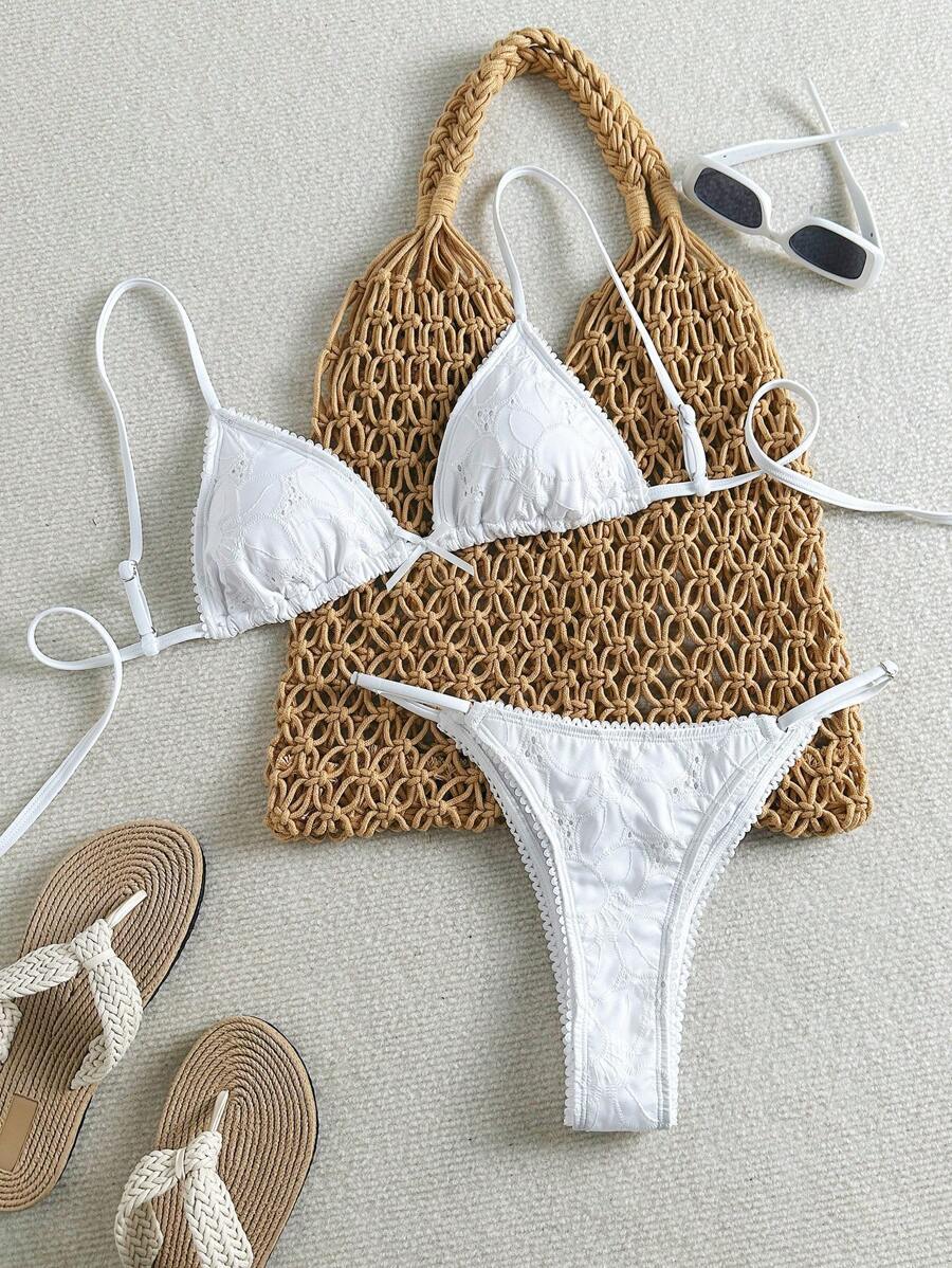 - レディース 水着 ビキニセット レディースホワイトビキニ水着、テクスチャード ファブリック、中空デザイン、夏のビーチ休暇のお出かけ
