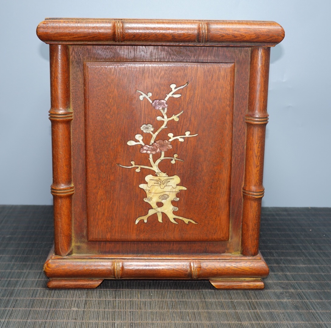 - ▽鴻▽ 花梨木製 細密彫 貝殼嵌 彩繪 梅蘭竹菊紋 画筒 置物 古賞物 中国古玩 中国古美術