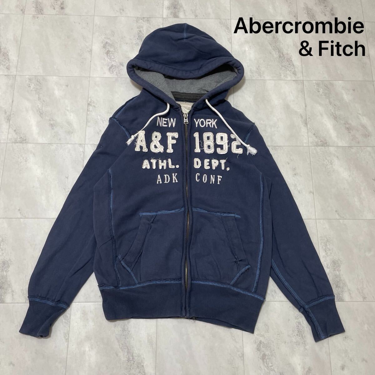 > Abercrombie&Fitch アバクロ ジップパーカー sweat hoodie スウェットパーカー 刺繍ロゴ ネイビー サイズM 玉FL3963