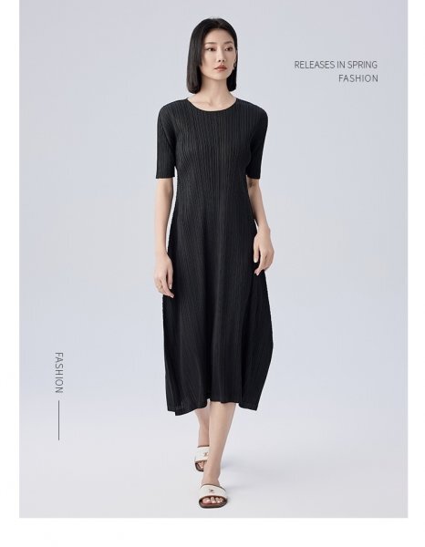 > 2503レディーストップスプリーツpleats半袖ワンピース弾力が肌触りドレープ性がいいシンプル大人可愛いブラック