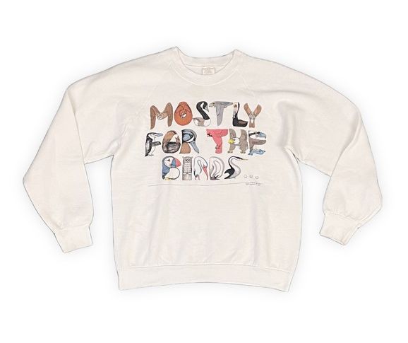 - 90's 米国製 フルーツオブザルーム FRUIT OF THE LOOM スウェット LUCIUS DUBOSE 鳥プリント MOSTLY FOR THE BIRDS 白 L [la-1215]