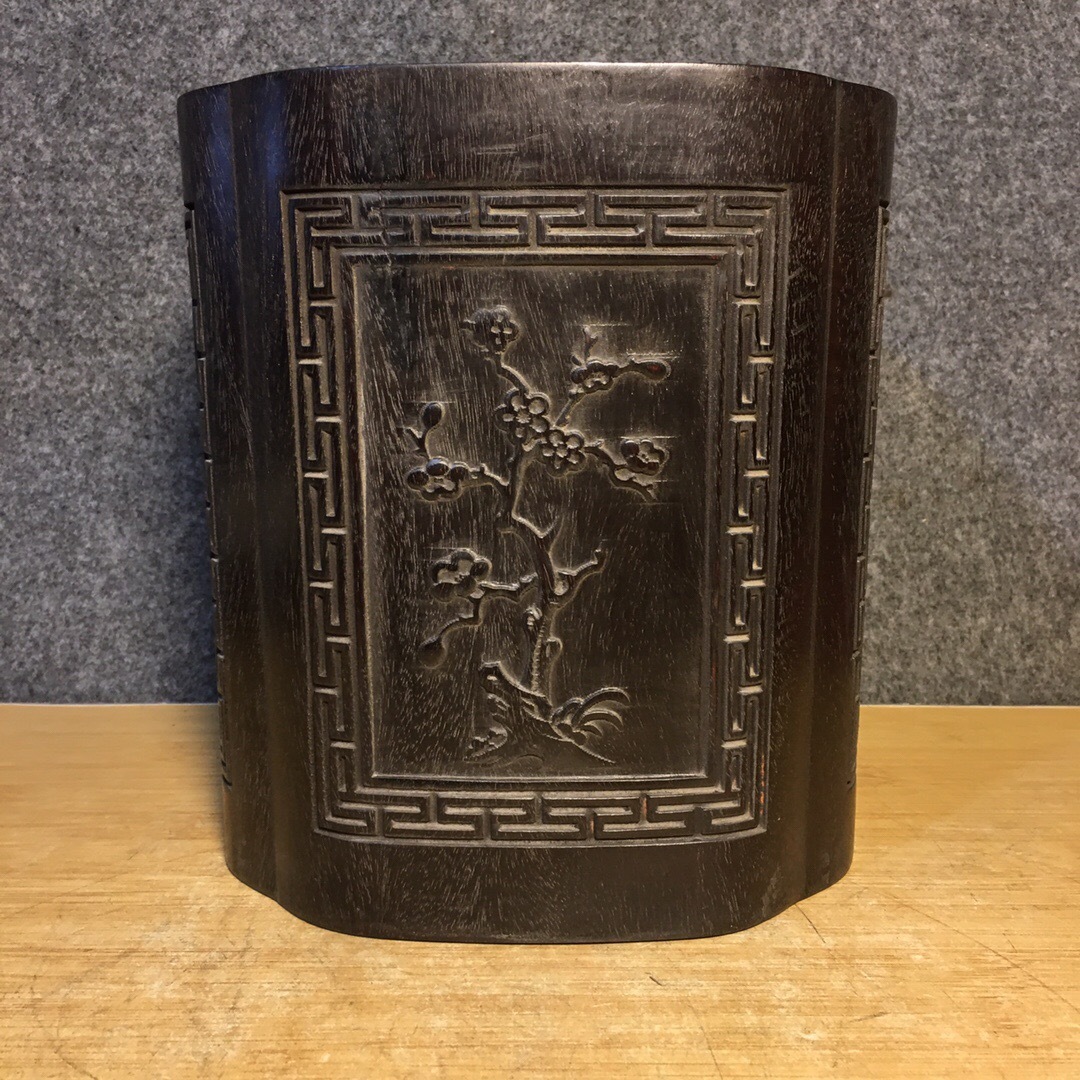 - 【仁】『紫檀木製・細密彫・梅花紋・筆筒・置物・賞物』極細工 古賞物 中国古玩 古美術 古美味