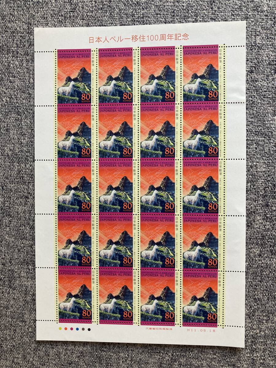 > ★未使用 日本人 ペルー 移住 100周年記念 ラマ マチュ・ピチュ遺跡 ナスカ地上絵 1999年 平成11年 切手シート 80円 20枚 日本郵便