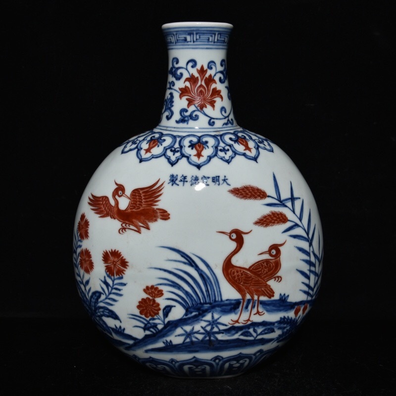 - 【仁】『明・宣德年製款・古陶瓷品・青花・梵文・蘆燕紋・膽瓶』極細工 古賞物 中国古玩 古美術 古美味