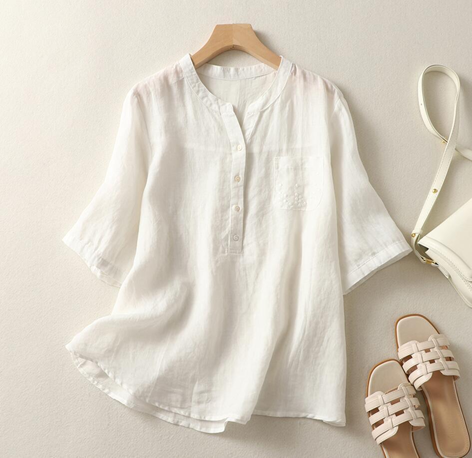 - 新入荷* 夏新品 カジュアル大きいサイズ ゆったり ブラウスシャツ 綿麻 刺繍り 半袖 チュニック * 白