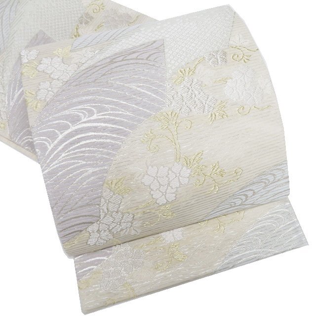 - 夏物 袋帯 中古 リサイクル 正絹 フォーマル 仕立て上がり 六通 花の図 地紙 波 箔糸 灰白色 多色 金銀 きもの北條 A1161-12