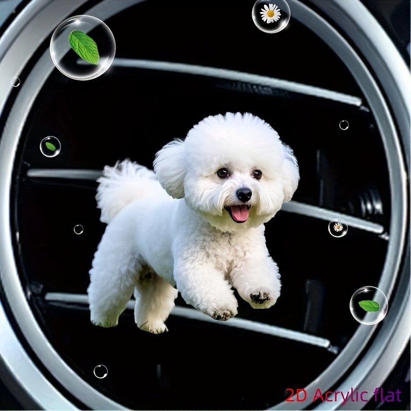 - 車用 芳香剤 エアコン イヌ ビジョン フリーゼ 白 6cm 吹き出し口 香り付き 走る犬 クリップ アクリル 平面 2D かわいい いぬ t5383