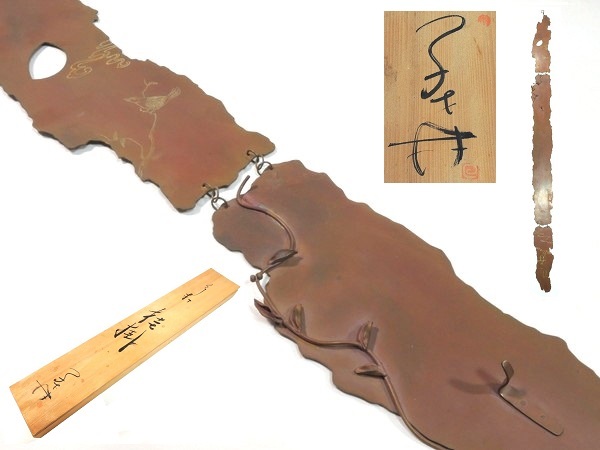 > 子才林 作/「手打 蔓花装飾 雲海鳥魚文 桂掛」/共箱付/全長:約128cm/金工細工/銅造/彫刻/作家物/骨董/古美術/美術品