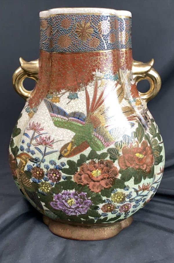 > 0u1k53A039 薩摩 薩摩焼 花器 金彩色絵 花鳥 細密絵付 花瓶 飾壷 高さ32cm 双耳 華道具 時代物 古美術品 骨董