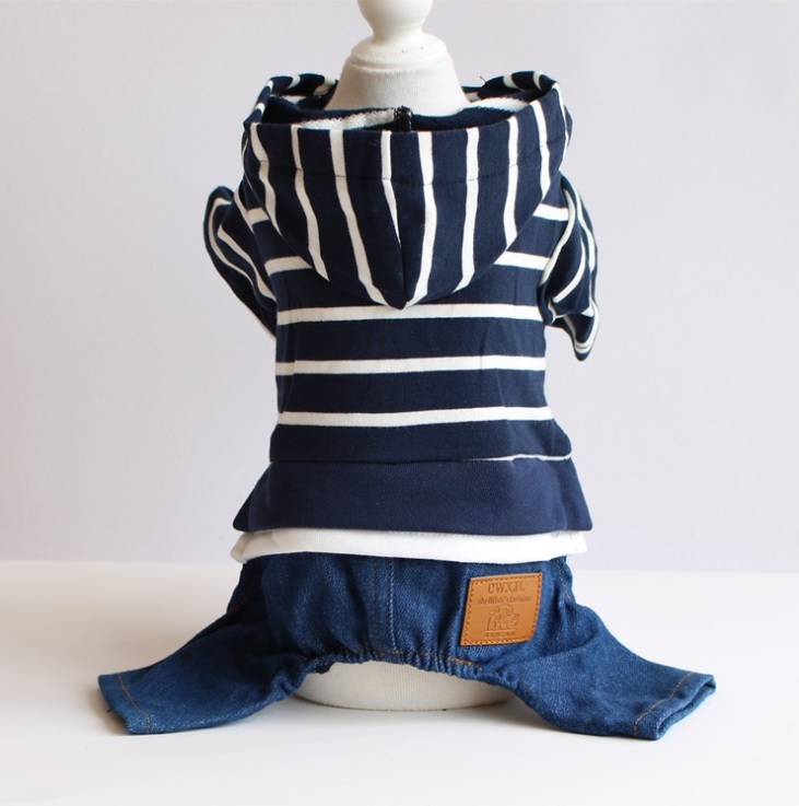 - Sサイズ ネイビー ロンパース ボーダー パーカー ジーンズ しましま ドッグウェア 犬服 カバーオール つなぎ チワワ トイプードル 小型犬