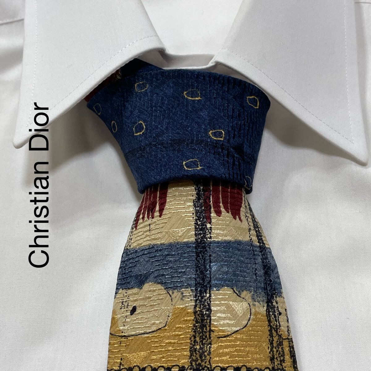 - Christian Dior クリスチャンディオール アート デザイン シルク ネクタイ カナダ製 ブルー ワイン ベージュ オーカー TG1212
