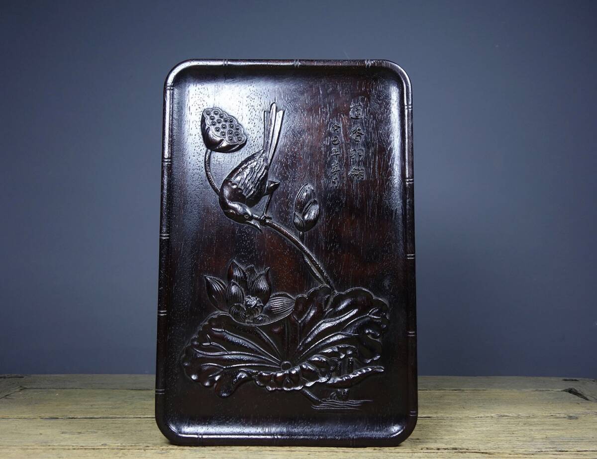 - ▽鴻▽ 紫檀木製 細密彫 荷趣紋 茶盤 置物 古賞物 中国古玩 中国古美術