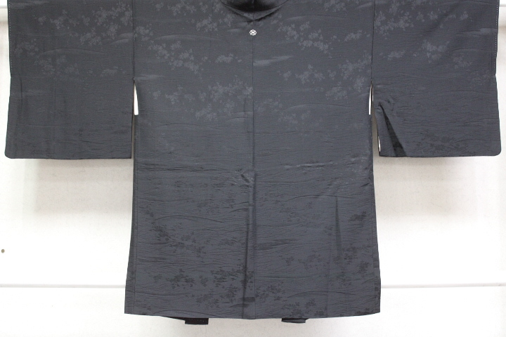 - きもの今昔8352 黒羽織コレクション 正絹綸子地一つ紋入り 家紋「剣花菱」すすき野の背景に花柄地模様 羽織丈82cm