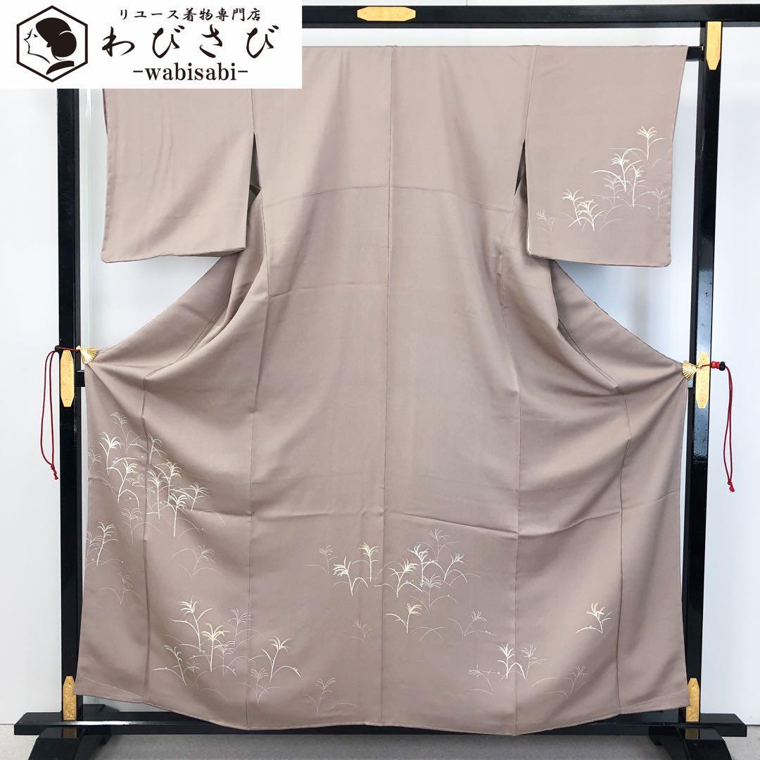 梅鼠色の落ち着きのあるお色味の縮緬に上品な草模様がデザインされた素敵な柄裄のお品でございます。