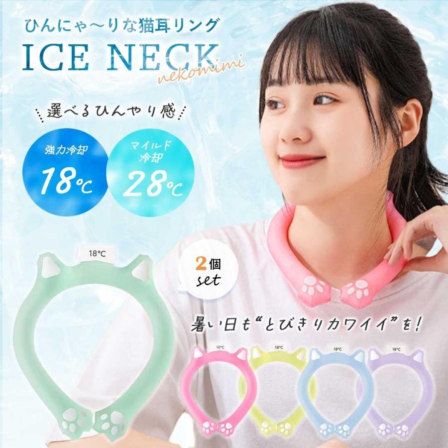 - 【2個】【5色から選択】【※購入後メッセージ下さい】ネッククーラー 猫 冷却 チューブ 2個セット ネックリング 猫耳付き 全5色 18℃以下 2