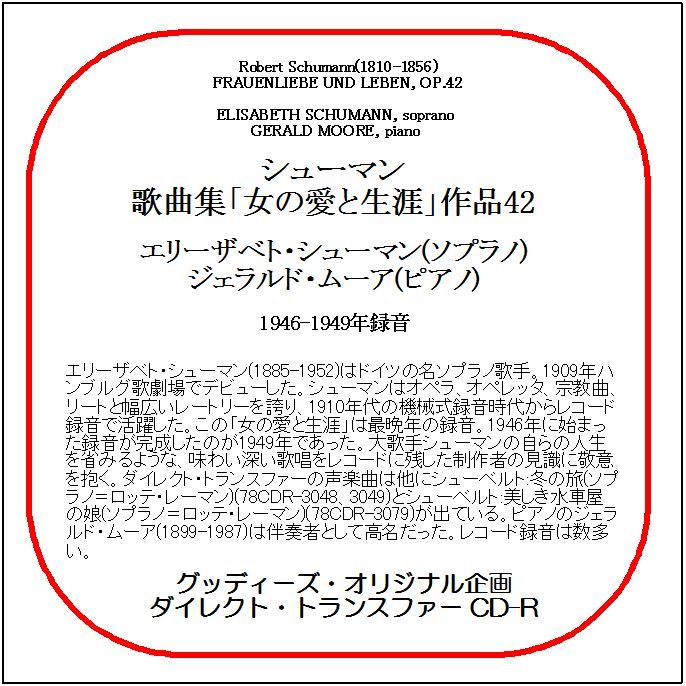 - シューマン:歌曲集「女の愛と生涯」/エリーザベト・シューマン/送料無料/ダイレクト・トランスファー CD-R