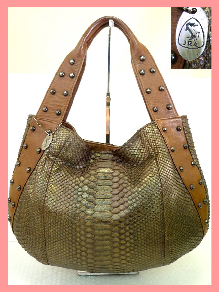 > JRA公認 極上 本革 レザー ショルダーバッグ ヘビ革 ゴールド ブラウン パイソン柄 肩掛け 光沢感 上品 鞄 かばん 人気 高級感 注目 必見