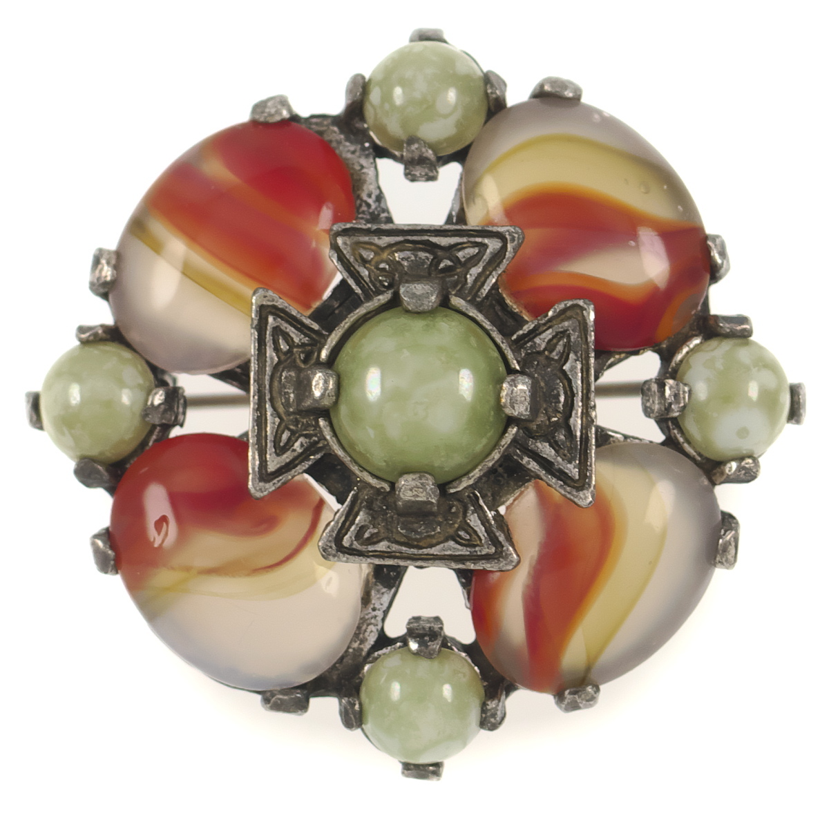 > UK3333◆ クロスモチーフ 朱色系&グリーン系マーブルストーン 色石 ケルト十字 英国 イギリス ◆ ヴィンテージブローチ◆