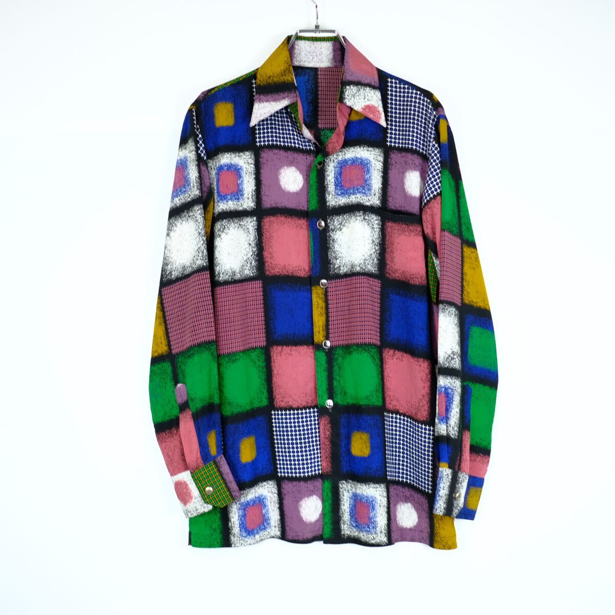 - 1970s ビンテージ 総柄 シルクシャツ チェック パッチワーク 古着屋 デザイン アート ポリ ヴィンテージ レトロ