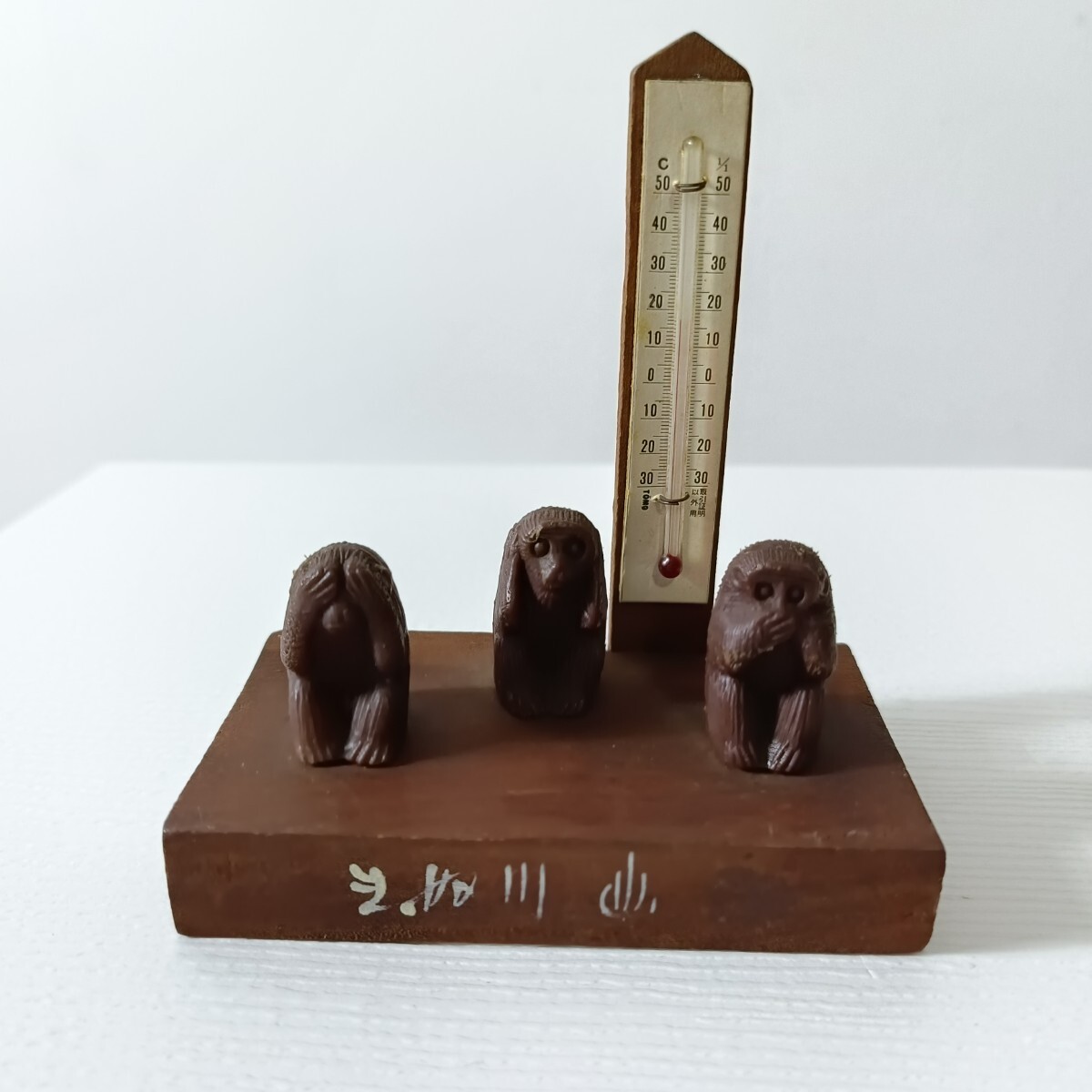 - 昭和期 日光 鬼怒川 見ざる言わざる聞かざる 見猿言わ猿聞か猿 温度計付き 置物 高さ10cm [和風置物 日本美術 日本人形 郷土玩具]