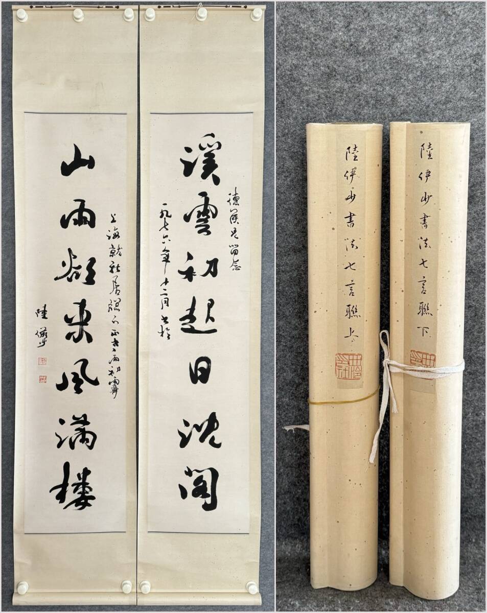 - 古美術 掛け軸 中国・近現代 「陸儼少書」 紙本 【七言楹聯】 立軸 書道 巻き物 肉筆保証 唐物 古画 画心137x33cm LT-2503308