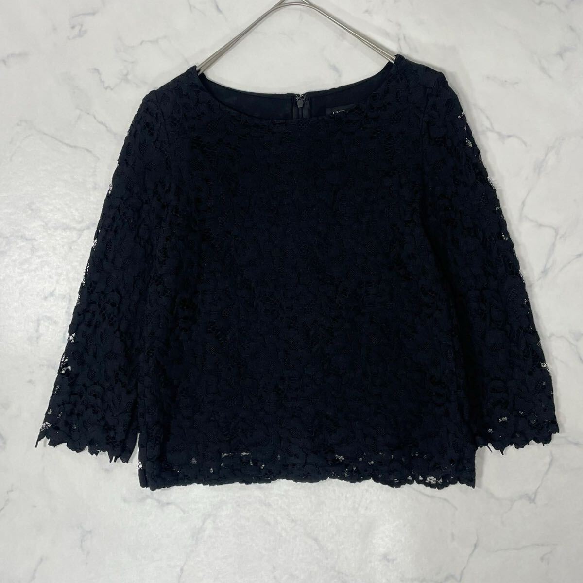 > 美品 UNITED ARROWS ユナイテッドアローズ ワントーン 花柄 レース 裏地付き クルーネック ジップ 七分袖 ブラウス ブラック