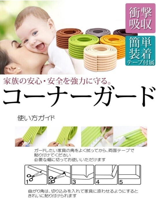 > ▲ROOCIA 乳幼児への安全対策に!】ベビー コーナーガード 波型 ケガ防止 クッション 全長2m かんたん設置 両面テープ付き (グリーン)