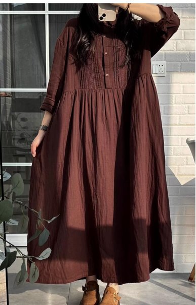 - yyレース ヒダ ワンピース ゆったり 切り替え ふんわり アンティーク風 ロマンファッション 純色 綿100% コーヒー色
