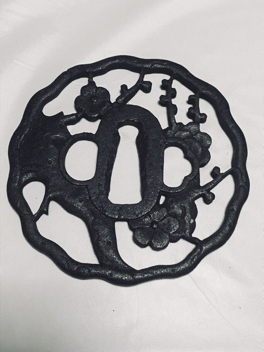 - ★薩摩梅図透かし鍔 鉄地 丸形鍔 鉄 丸形 時代武具 刀装具 透かし 古物 時代物 鉄地透かし鍔 ツバ 骨董 小物