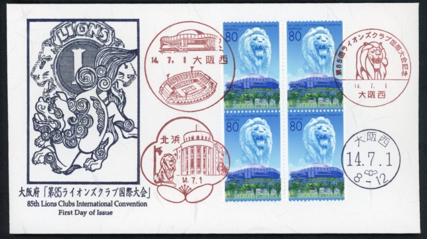 - 1336 【FDC】ふるさと 大阪府「第85回ライオンズクラブ国際大会」[大阪西、北浜/14.7.1/鳴美版](解説書なし)