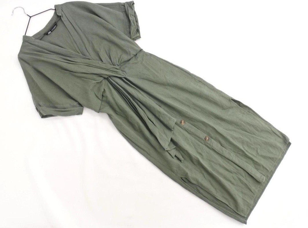 - ZARA ザラ リネン混 ツイストギャザーIラインワンピース Sサイズ カーキ