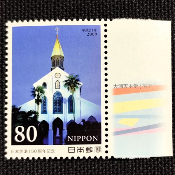 > [25040909]【日本開港150周年切手 長崎】単片 耳紙付「大浦天主堂」80円 2009年発行 美品