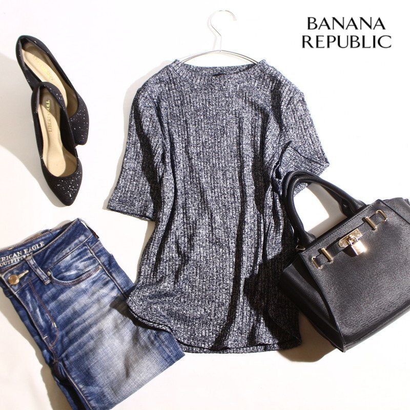 - 美品 バナナリパブリック Banana Republic 春 夏 ミックス サマーニット 半袖 カットソー XS ネイビー 紺 ホワイト ポリエステル レーヨン