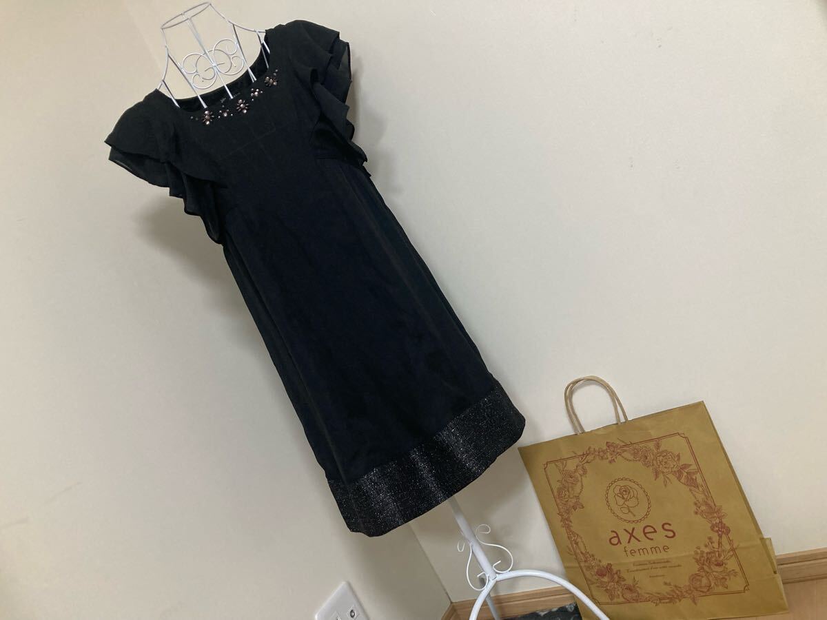 > アクシーズファム☆ビジュー.レース飾りおリボン飾り裾スリット糸入り生地重ねフレア袖シフォンワンピース☆used