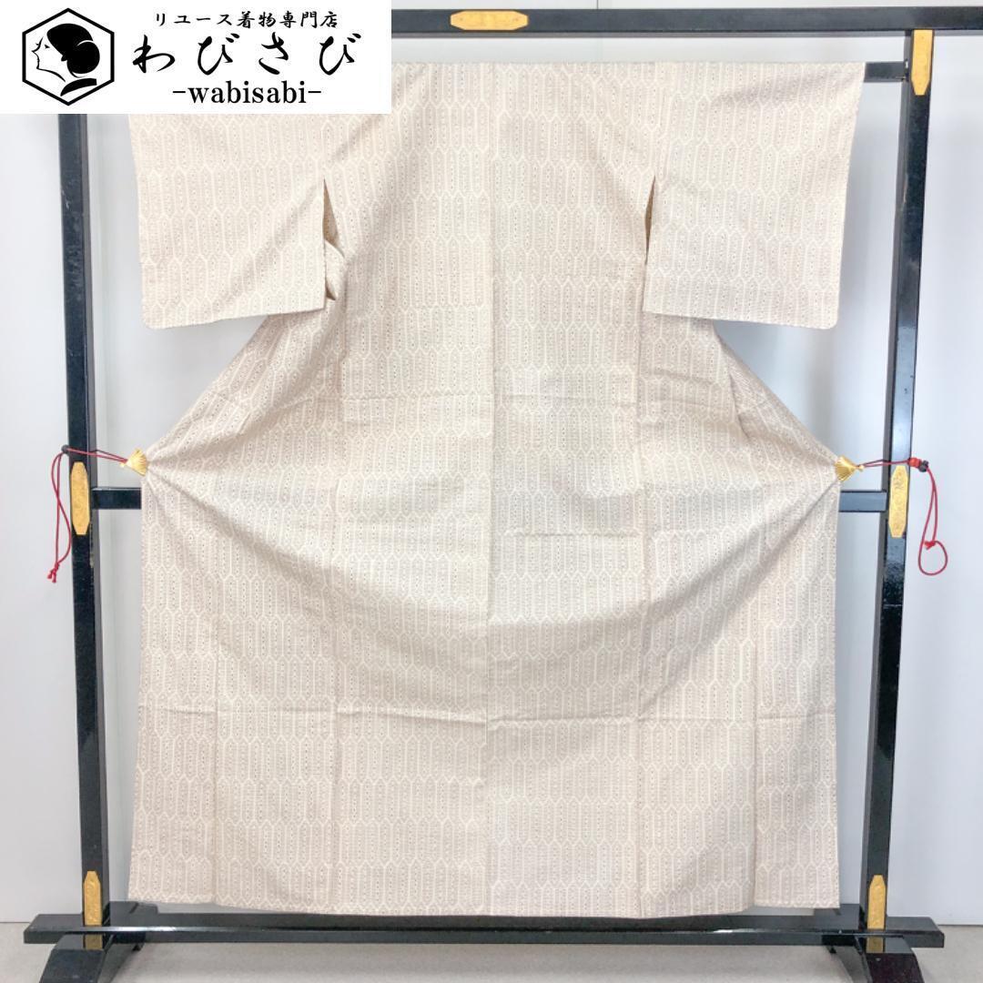 - 単衣 紬着物 縦柄織模様 白茶色 K-4577 着物 きもの kimono 和服 和装 中古 リサイクル着物 【送料無料】