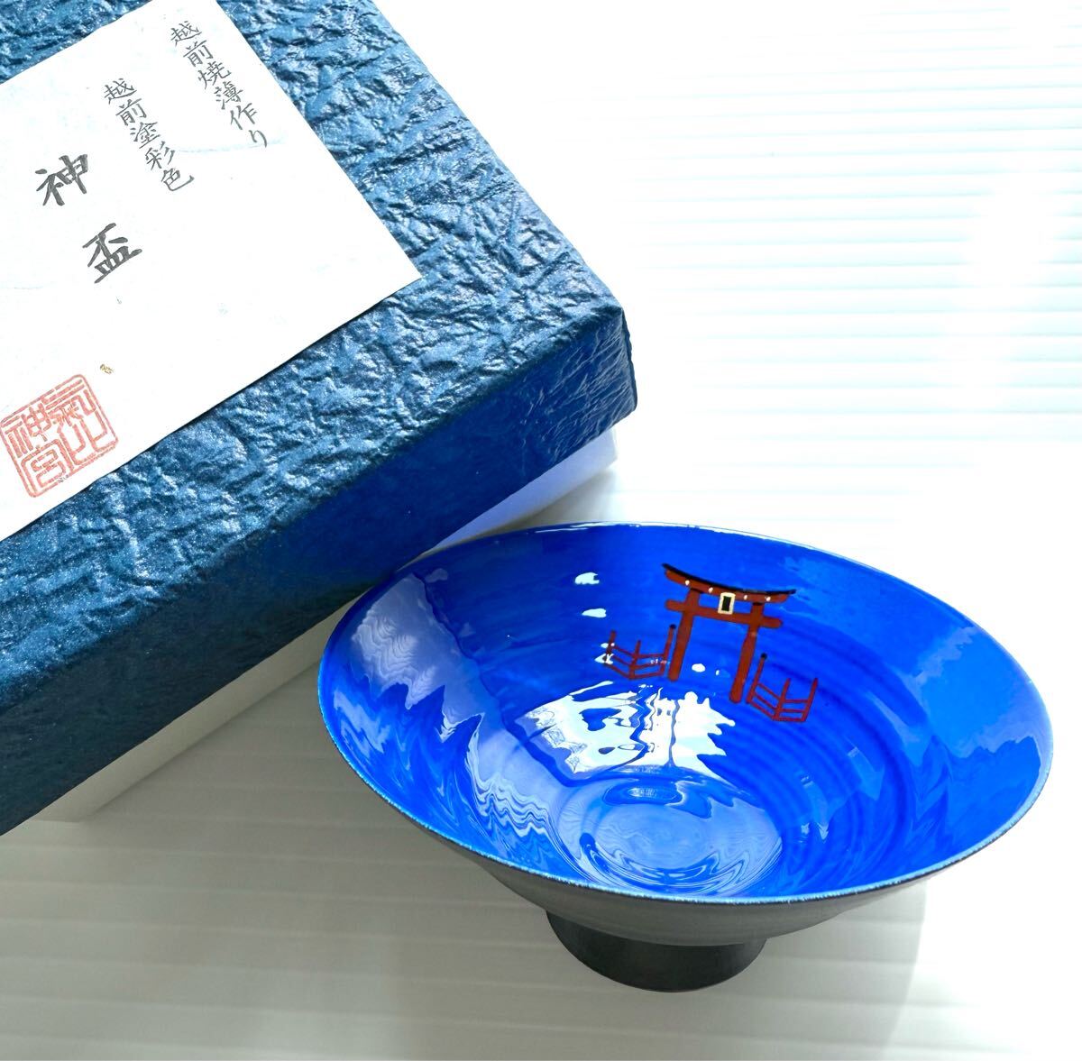 > 神盃 神具 青 氣比神宮 北陸最強 芭蕉 越前焼 陶漆 伝統工芸 竜仙窯 未使用 約8.5cm 鳥居 三大木造大鳥居 重文 盃 百名月 招福 月見 蒔絵