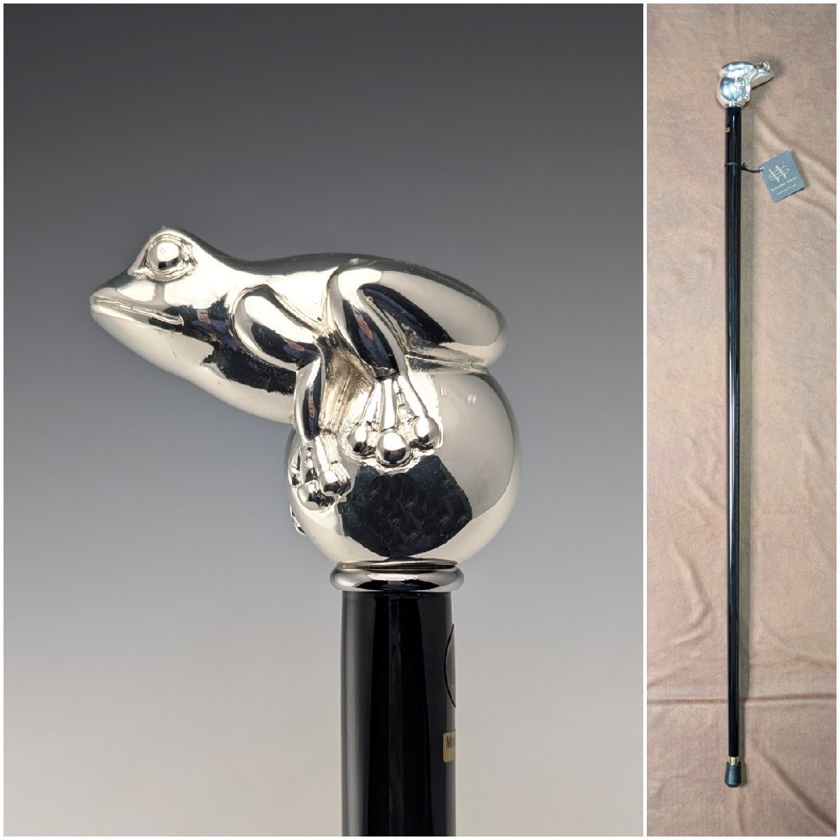 純銀製のハンドル部分は「玉に乗った」カエルのユニークなデザインとなっています。