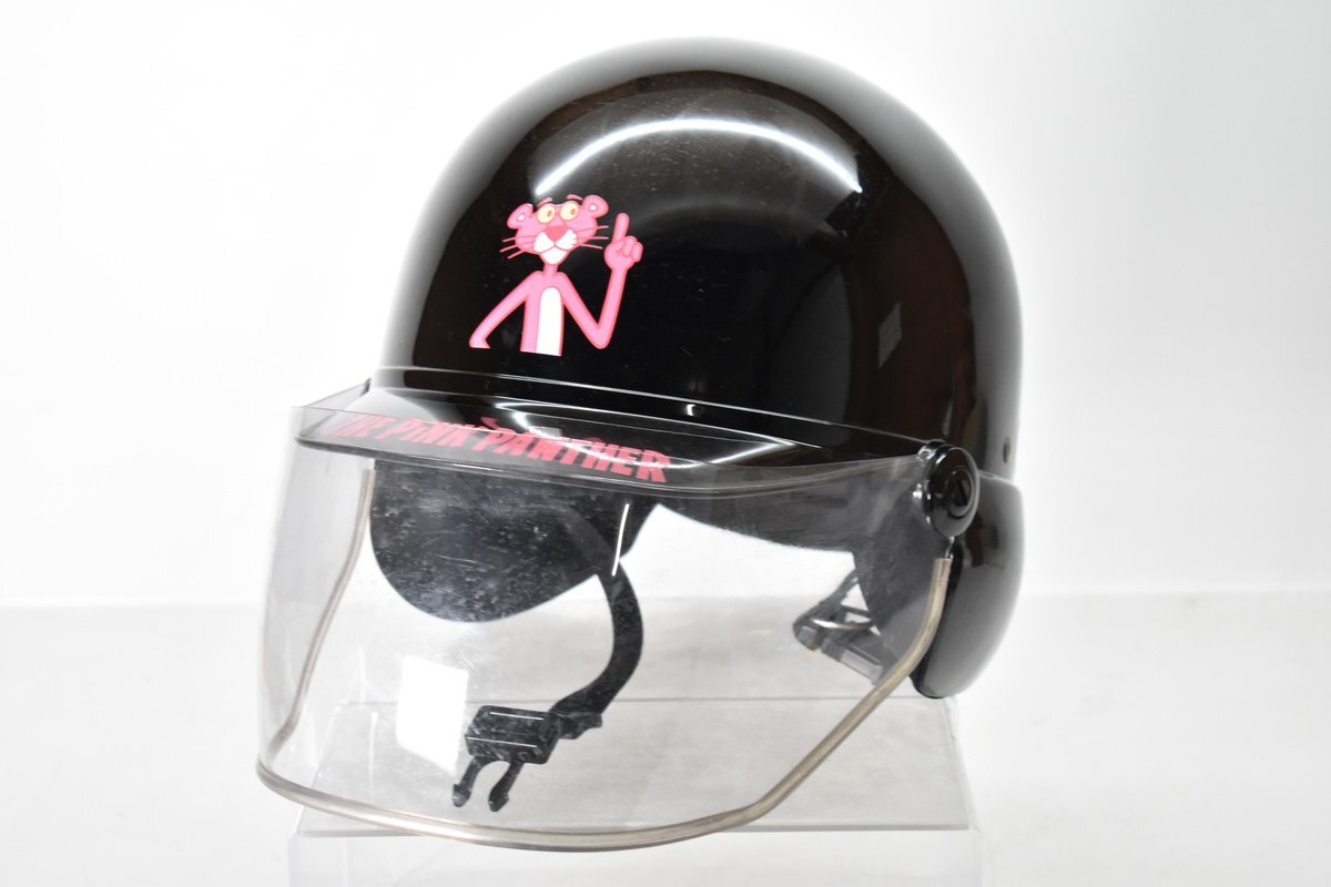 - 希少 立花カスタム ピンクパンサー 半キャップ ヘルメット 黒 シールド付[タチバナ][半ヘル][ハーフ][80年代][旧車][族ヘル][当時物]H