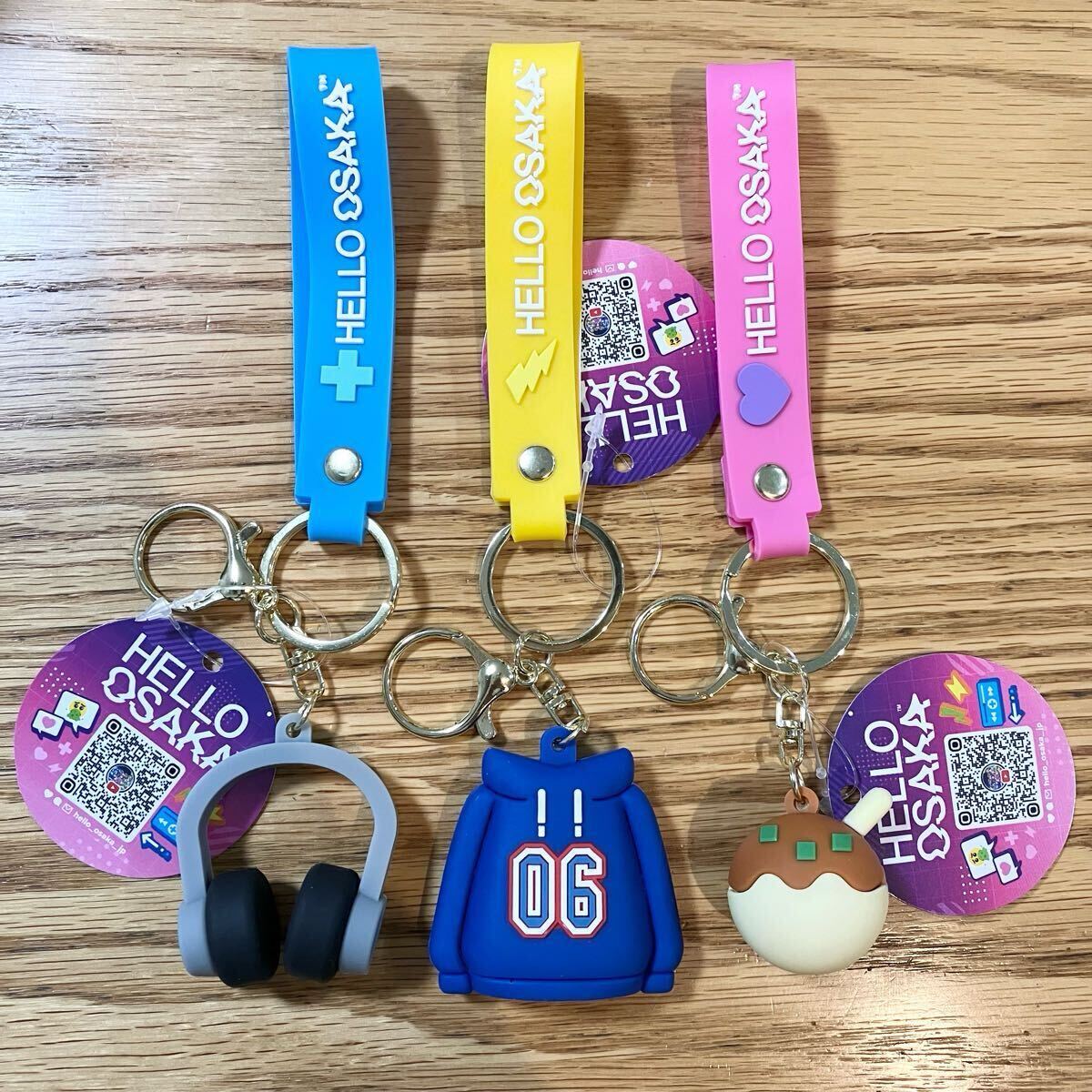 - 即決 新品 非売品 HELLO OSAKA ラバーマスコット付きストラップ 全3種 キーホルダー パーカー ヘッドホン たこ焼き 大阪 モーリー限定