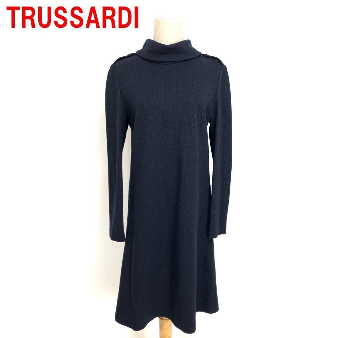 > A5526トラサルディ ロングワンピース ウール 綿 TRUSSARDI コットン ネイビー 長袖 フレアストライプ 紺 40