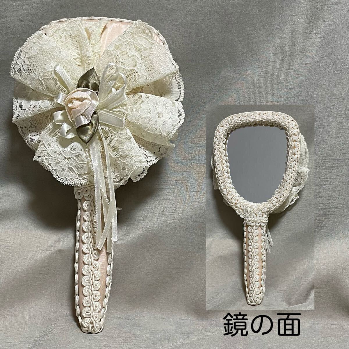 > レースリボン ブレードリボン 装飾 手鏡 ハンドミラー 薄ピンクローズ ホワイトベージュ 姫系 ふんわりロココ レディース メイク雑貨 小物